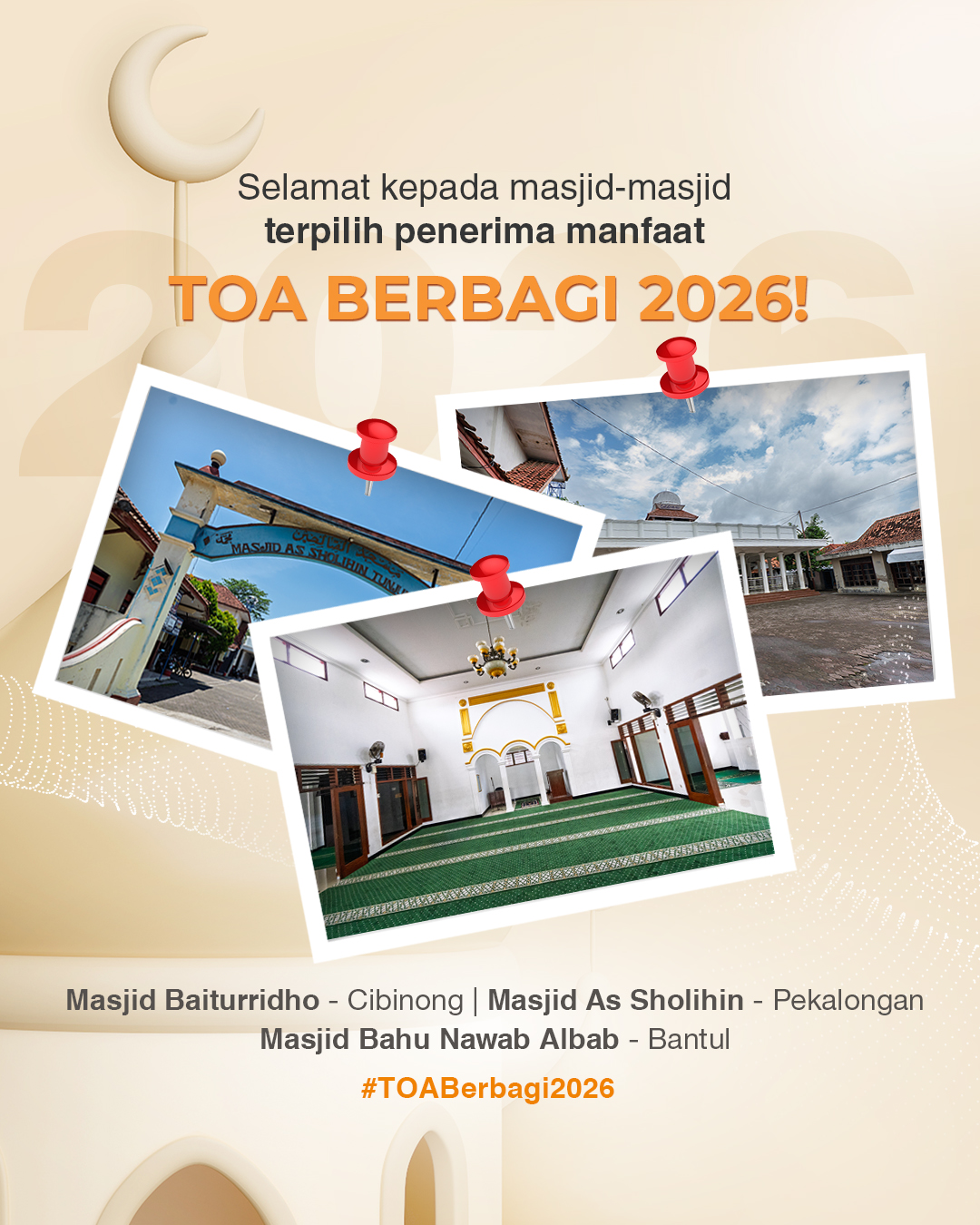 Pada Program TOA Berbagi 2026, TOA Indonesia menetapkan tiga masjid sebagai penerima manfaat, yaitu Masjid Baiturridho (Cibinong), Masjid As Sholihin (Pekalongan), dan Masjid Bahu Nawab Albab (Bantul). Pemilihan masjid dilakukan melalui proses seleksi dengan mempertimbangkan kebutuhan sistem audio serta kesiapan lokasi untuk menunjang aktivitas ibadah, khususnya selama Ramadan.